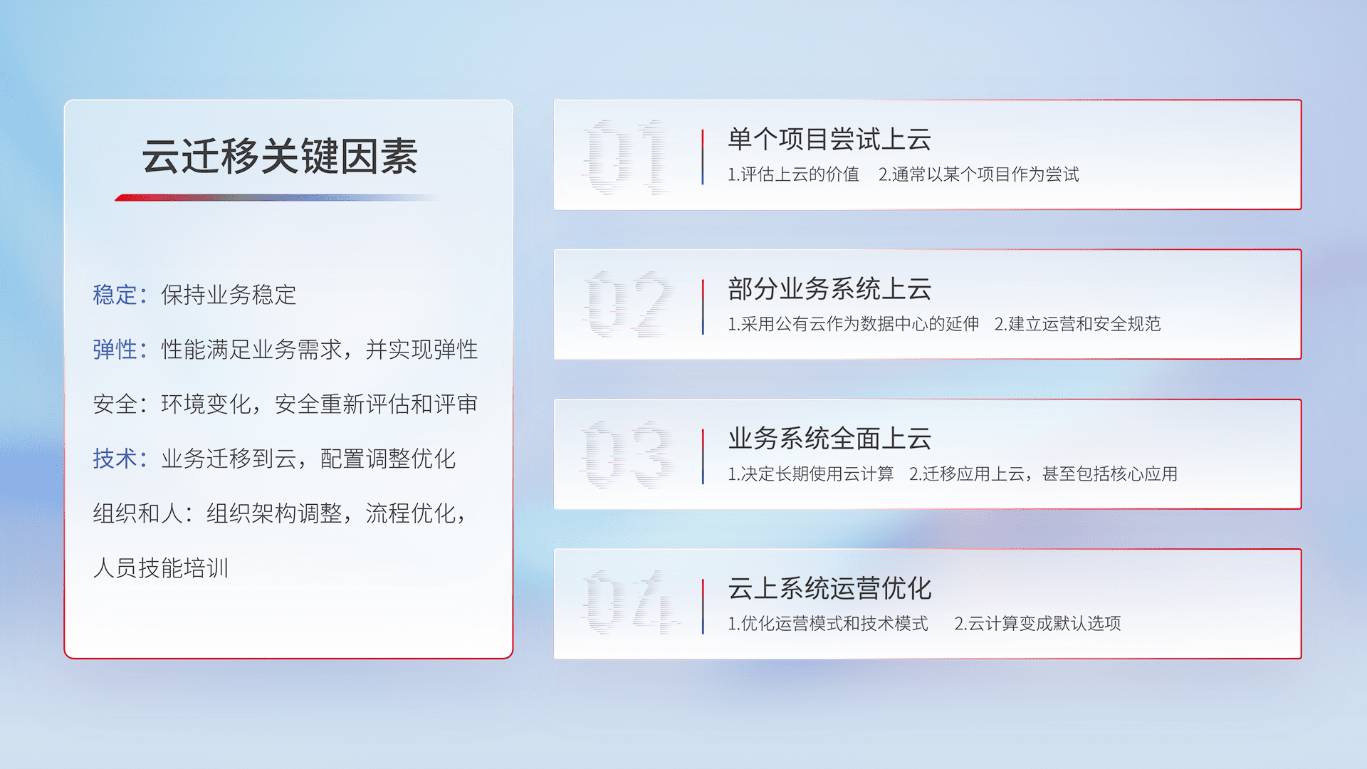 结合实际业务,,,从规划设计、、、、云平台选型、、、、云原生改造、、、、数据迁移、、、集成交付,,,,迁移全过程为客户识别最佳上云路径,,,做好风险识别管理,,设计网络架构、、、身份权限、、、、安全审计合规、、操作审计、、日志审计、、、监控告警策略、、、、多站点容灾设计等,,,,对云上基础设施进行整体规划,,提升IT治理水平,,,以满足弹性、、、、高可用、、高性能的需求。。