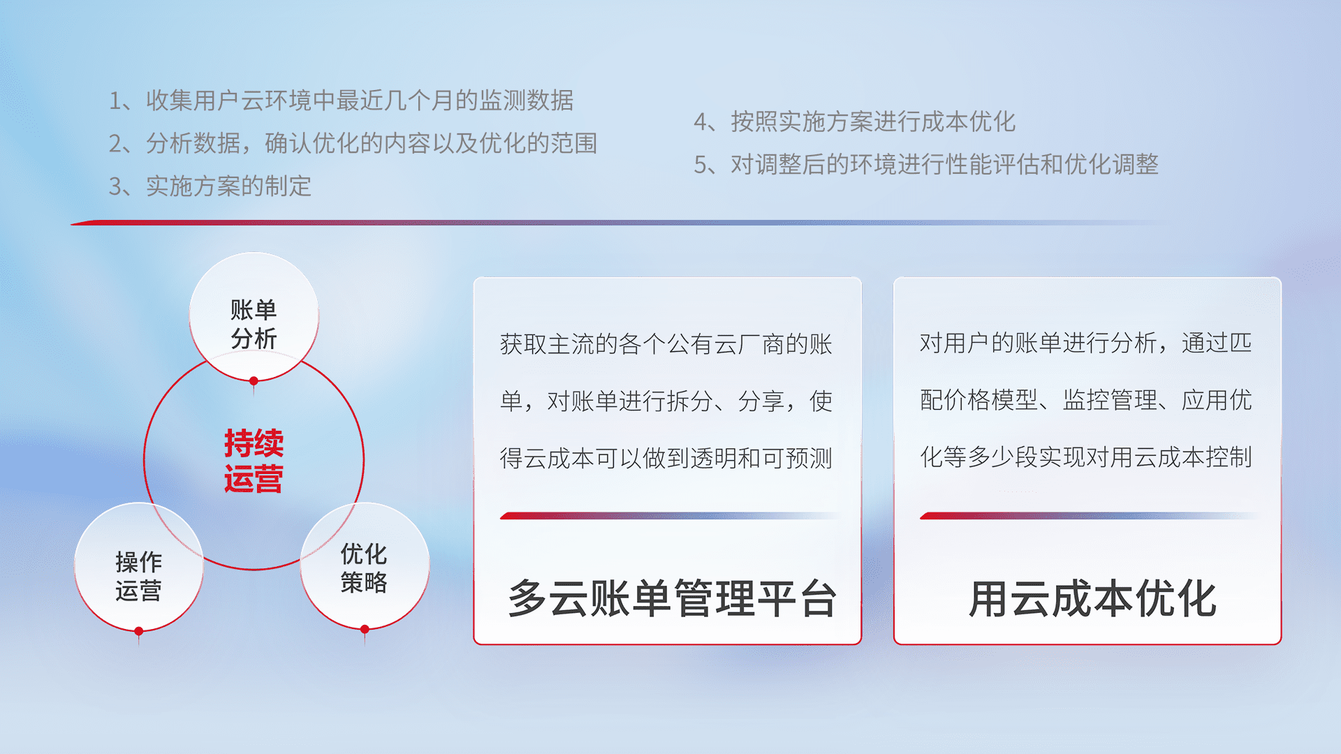 通过多云纳管,,,以统一的资源数据模型把客户的云资源进行抽象和封装,,,进而实现对多云资源的统一操作,,保障云资源管理的可靠性、、、稳定性与可用性。。。。量身定制化运维内容,,,,配置、、、、开发运维、、、补丁管理、、备份、、、、监控、、、认证和访问管理、、、、审计和日常巡检等,,,保障在用云过程中的可靠度,,稳定度以及高可用率。。